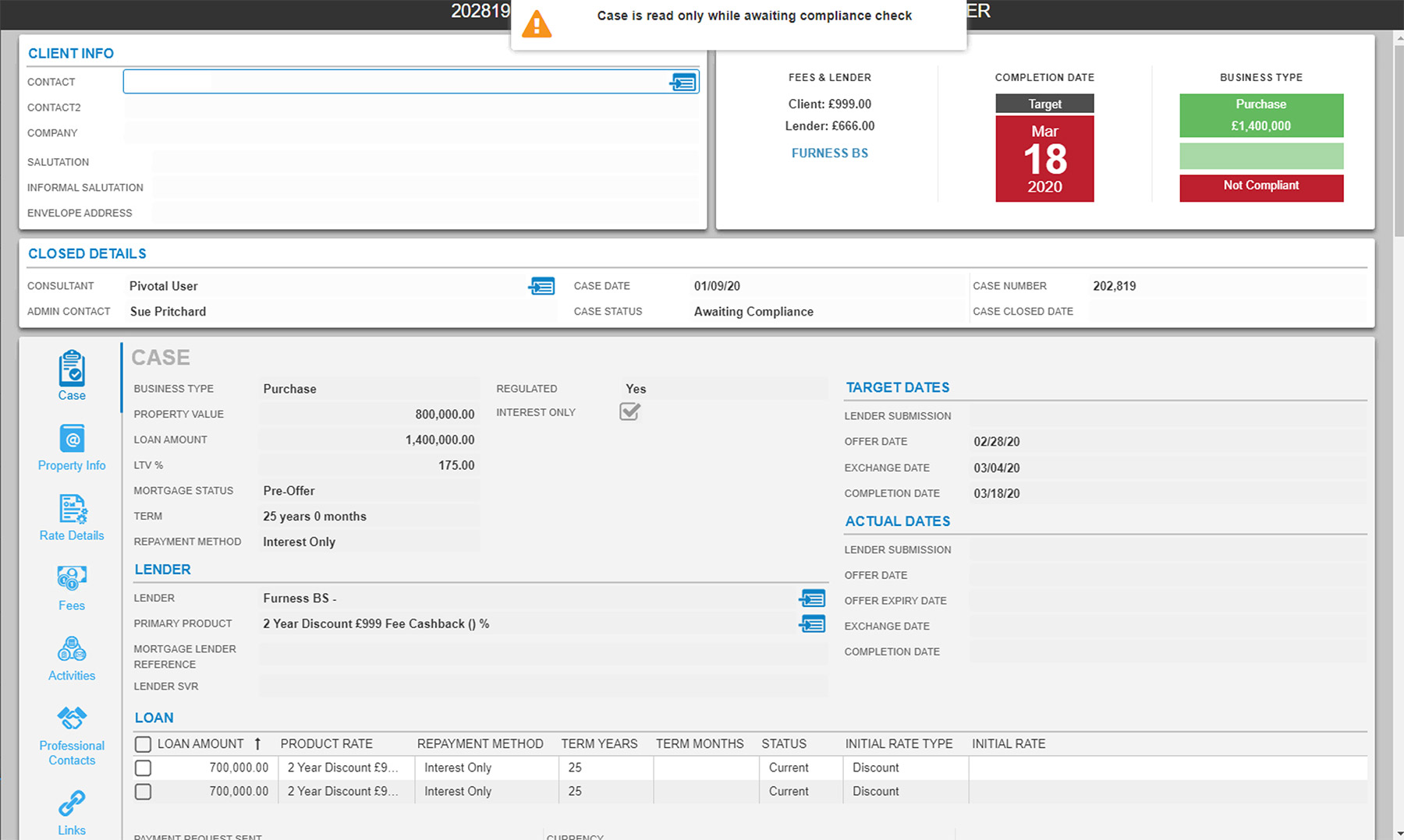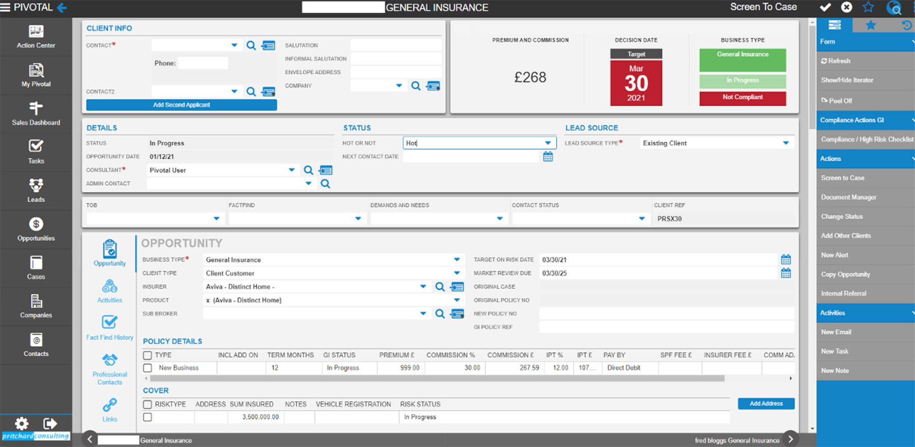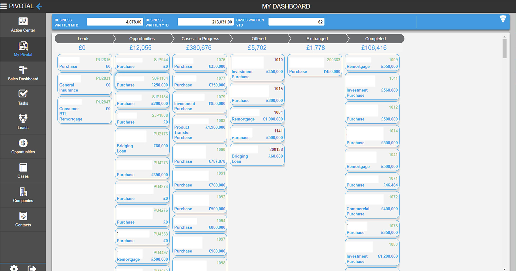 Once a Sales Opportunity has passed Compliance it is converted to a Case, here the Administration team typically take over whilst at the same time PivotalFS allows the Sales Consultant to be fully aware of process.