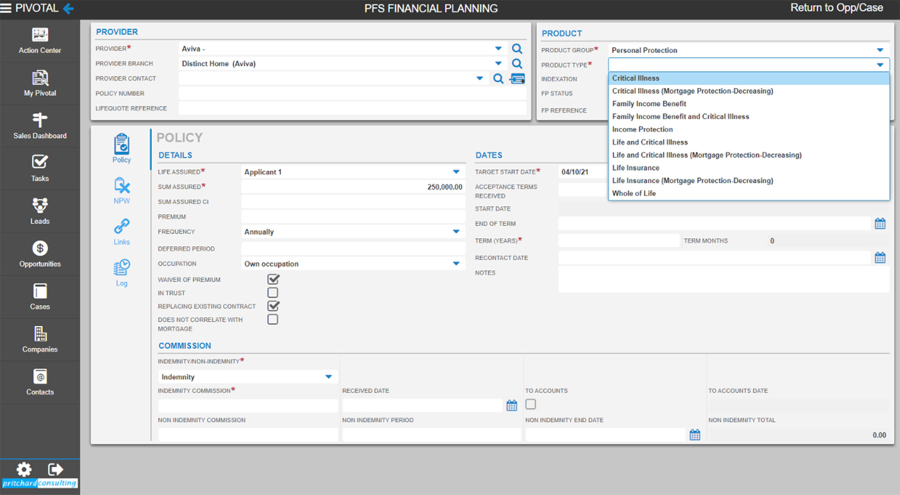 PivotalFS supports the cross selling of specialty protection products sold either in conjunction with a Mortgages or as independent product lines. Specialist Financial planning advisors can work closely with other members of the Sales team.